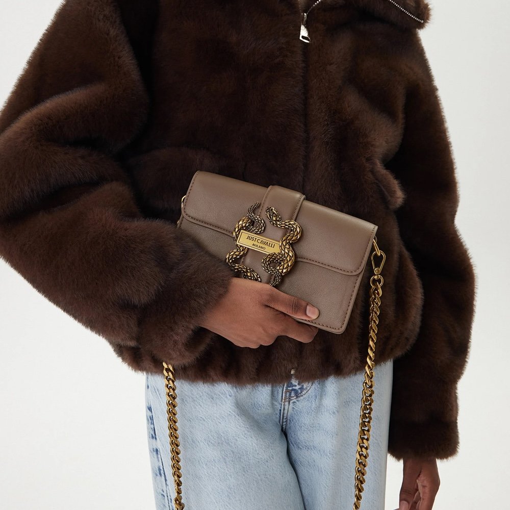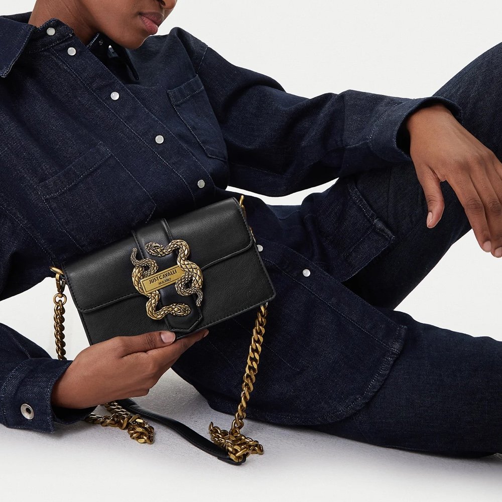 Just Cavalli collections include Shoulder Bags Known for their versatility and stylish look, often feature animal prints and motifs, bright colors, metallic accents, tiger motif logo, gold-tone metal plaques that decorate the front of the bags. Tote bags: are spacious and perfect for every day carry on, often seen with the brand's signature Just Cavalli motifs and details. Crossbody: These bags often are more casual and casual hands free option with bold and playful elements. Clutches / Mini Bags: Just Cavalli statement evening wear often embellished with luxurious materials, unique textures and strong logo recognition. Backpacks: Combining functionality with fashion, usually Just Cavalli backpacks feature bright prints and construction. Just Cavalli bags are characterized by their high-quality materials, fashionable designs, and a touch of Italian flair, popular among brands and fashion couture lines.