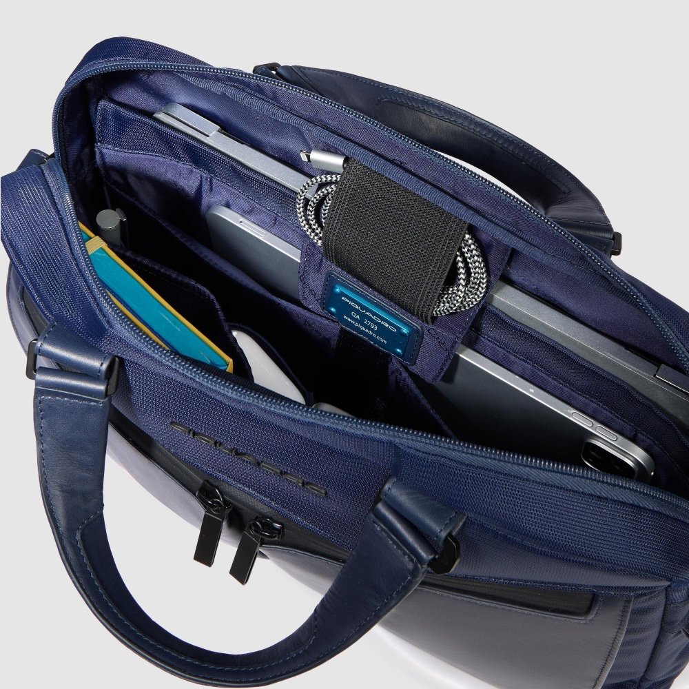 Laptop and iPad®Pro 12,9″ bag in recycled fabric and leather with two dividers, shock absorbing and RFID protections and pocket for AirPods®